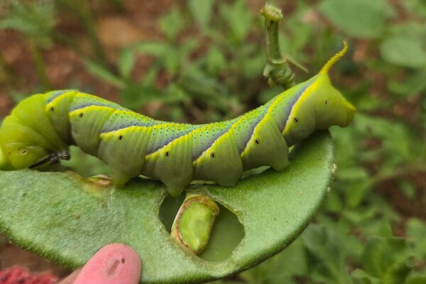 భారతదేశంలో నమోదైన అతిధేయ మొక్కలలో వంకాయ, జీలకర్ర, వేరుశనగ, లాబ్లాబ్, జాస్మిన్, డాతురా జాతి, స్పాథోడియా కాంపనులాటా, మిల్లింగ్టోనియా హార్టెన్సిస్, జామున్, టేకు మొదలైనవి ఉన్నాయి. ఆకుల దిగువ భాగంలో లార్వా కనిపిస్తాయి, ఇవి అంచుల నుండి ఆకులు రాలిపోతాయి. లార్వా బలిష్టంగా, ఆకుపచ్చగా ఉంటుంది, నీలం / ఆకుపచ్చ, నల్లటి స్పిరకిల్స్ మరియు పైభాగం దగ్గర పసుపు కొమ్ము / తోకతో కప్పబడిన పసుపు రంగు వాలుగా ఉండే బ్యాండ్‌లతో ఉంటుంది మరియు ప్యూపా అయ్యే…